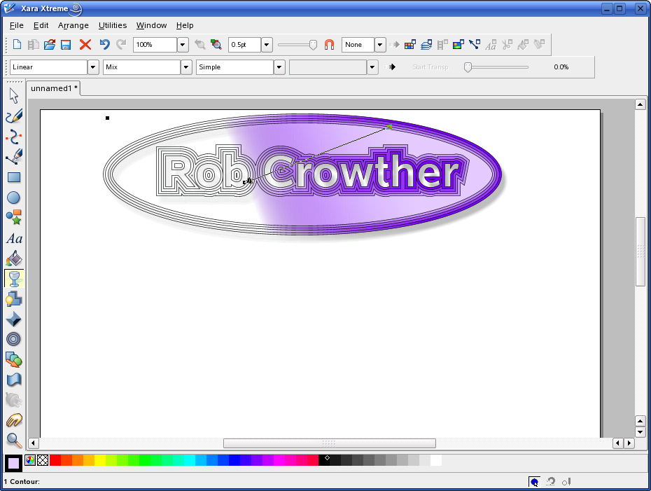 I discovered Xara Xtreme the other day. Xara have apparently open sourced their code for the windows version and members of the Linux community have taken the code and run with it. It is now a very fast (it runs well even on my creaky old laptop) and very useable vector graphics editor available for most recent Linux builds (I was able to find it in Fedora Extras, the Gentoo Sunrise overlay, and also had no problem getting it working on SuSE from the bz2 archive). Here is a screenshot of it in action (click for full size image):