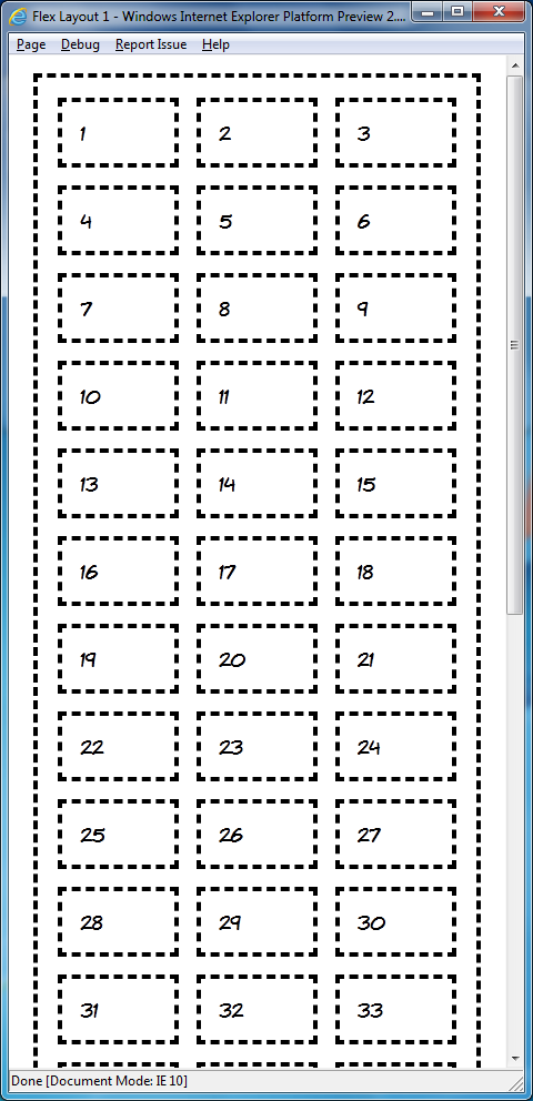First up the flexible box layout module, or flexboxes. This has already been implemented in Firefox and WebKit, but that version of flexboxes isn't very intuitive, and the draft has since seen a lot of updates. Interestingly, IE10PR1 implements the same version of the spec as Firefox and WebKit but with one important addition: multi-line flexboxes. For me the multi-line properties are what make flexboxes worthwhile for layout, otherwise nearly everything you might currently want to achieve can be done just as easily (and with better backwards compatibility) with display: table-cell.