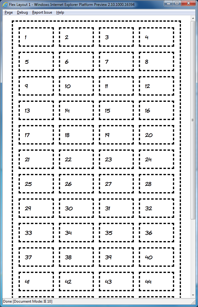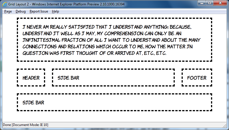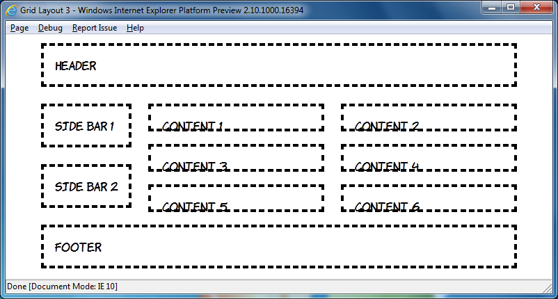 So, multi-line flexboxes could be a useful addition to the CSS toolbox when everyone gets round to upgrading to IE10, but, cool as they are, that's not the coolest experimental CSS layout implementation in IE10PR1. There have been a few grid and template based CSS proposals over the years but, apart from an incomplete JavaScript library for CSS Template Layout, none of them have ever been implemented in a major desktop browser. That is until last week, when IE10PR1 implemented Microsoft's own CSS Grid Align proposal from October 2010.