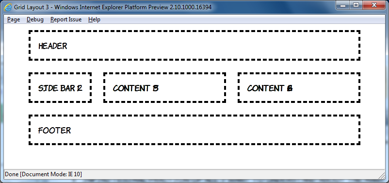 header { -ms-grid-column: 1; -ms-grid-row: 2; } aside.b { -ms-grid-column: 2; -ms-grid-row: 2; } article { -ms-grid-column: 1; -ms-grid-row: 1; -ms-grid-column-span: 3; } aside.d { -ms-grid-column: 1; -ms-grid-row: 3; -ms-grid-column-span: 3; } footer { -ms-grid-column: 3; -ms-grid-row: 2; }
