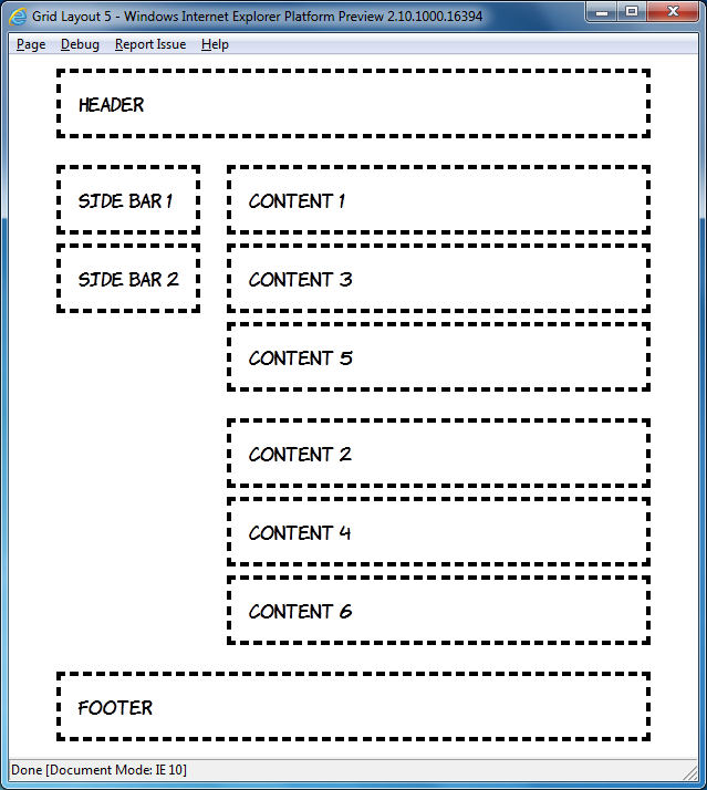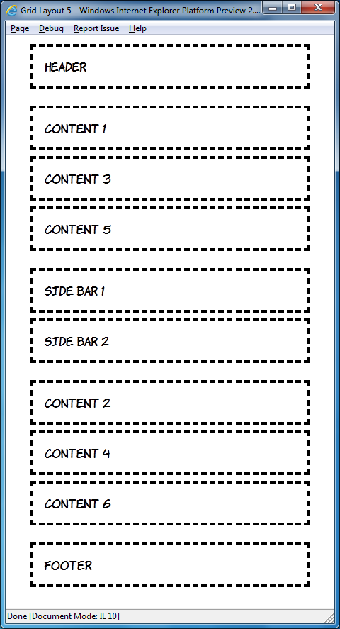 body { width: 90%; height: 90%; margin: 0 5%; display: -ms-grid; -ms-grid-rows: auto; -ms-grid-columns: 1fr; } article, aside, header, footer { margin: 1em; padding: 1em; outline: 4px dashed black; } header { -ms-grid-row: 1; } #sidebar { -ms-grid-row: 3; } #content1 { -ms-grid-row: 2; } #content2 { -ms-grid-row: 4; } footer { -ms-grid-row: 5; }